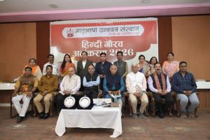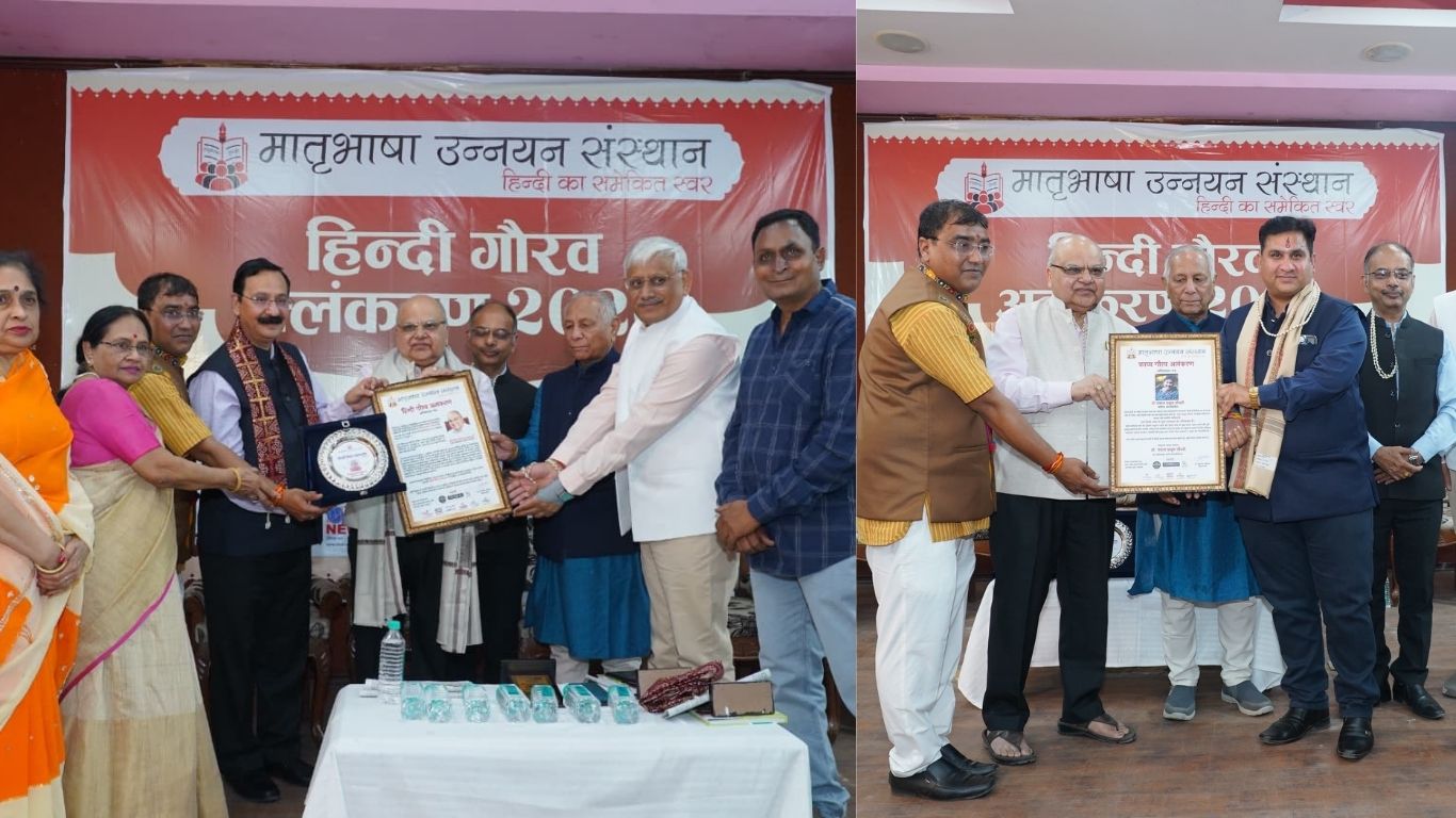 इंदौर(विनोद गोयल)। हिन्दी के समवेत स्वर के रूप में कार्यरत ‘मातृभाषा उन्नयन संस्थान’ द्वारा हिन्दी गौरव अलंकरण समारोह आयोजित किया गया, जिसमें वर्ष 2026 का हिन्दी गौरव अलंकरण वरिष्ठ साहित्यकार नर्मदा प्रसाद उपाध्याय व अतुल तारे को विभूषित किया गया।