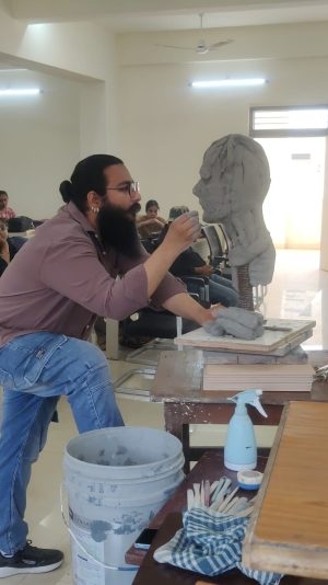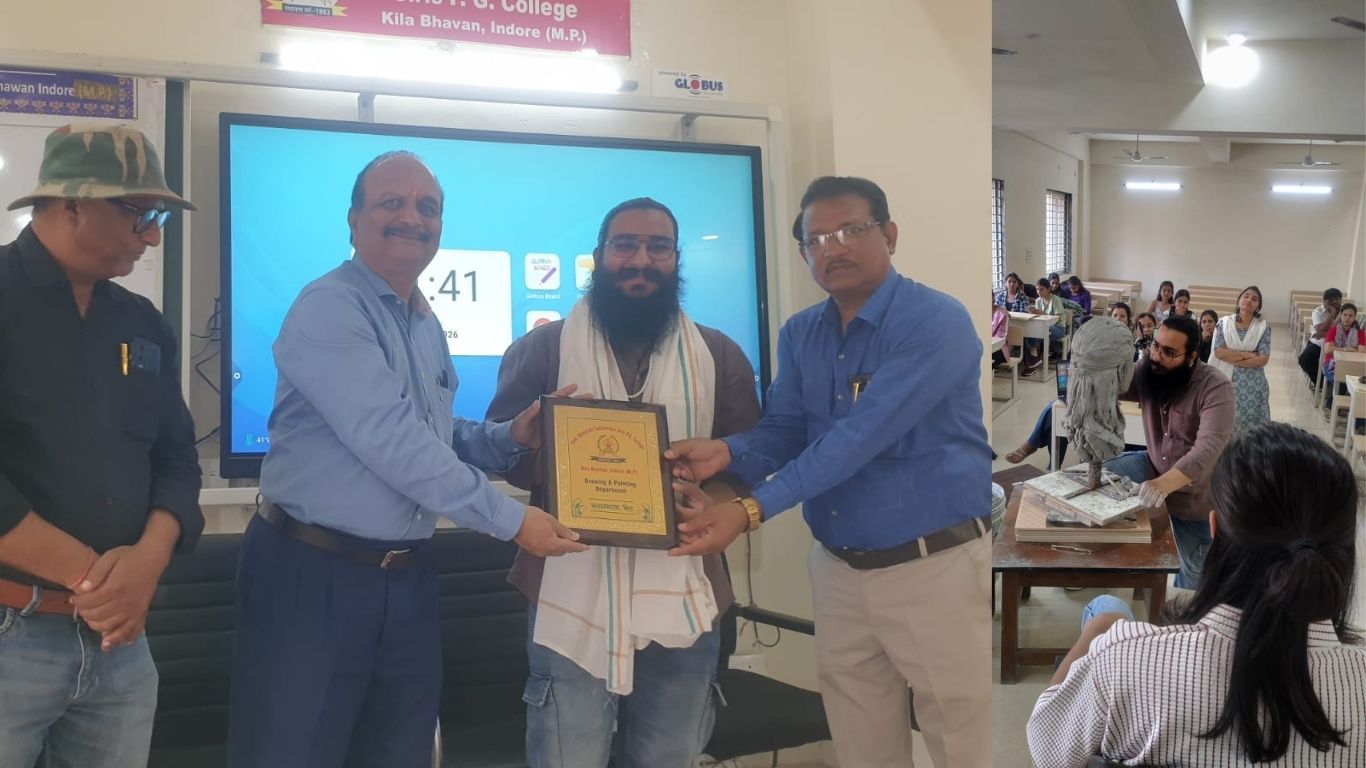 इंदौर (विनोद गोयल)। शासकीय महारानी लक्ष्मीबाई कन्या स्नातकोत्तर महाविद्यालय के चित्रकला विभाग एवं एकाग्र एनजीओ के संयुक्त तत्वावधान में आयोजित एक दिवसीय राष्ट्रीय कार्यशाला में आर्टमीसिया कॉलेज ऑफ आर्ट एंड डिजाइन के प्रख्यात मूर्तिकार एवं प्रोफेसर गौरव सोनी ने अपनी कलात्मक प्रस्तुति से लगभग 158 प्रतिभागियों को मंत्रमुग्ध कर दिया।