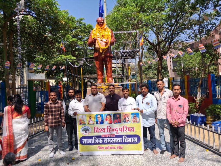 इंदौर। संविधान निर्माता और भारत रत्न डॉ. भीमराव अंबेडकर की जयंती के अवसर पर बजरंग नगर में विश्व हिंदू परिषद एवं बजरंग दल द्वारा “समरसता दिवस” के रूप में एक भव्य एवं प्रेरणादायी कार्यक्रम का आयोजन किया गया। इस अवसर पर बड़ी संख्या में कार्यकर्ताओं एवं स्थानीय नागरिकों की उपस्थिति में बाबा साहब की प्रतिमा पर माल्यार्पण कर उन्हें श्रद्धांजलि अर्पित की गई तथा उनके आदर्शों को आत्मसात करने का संकल्प लिया गया।